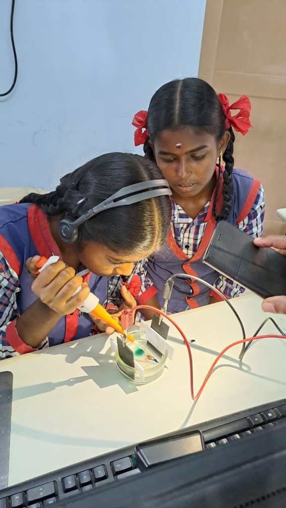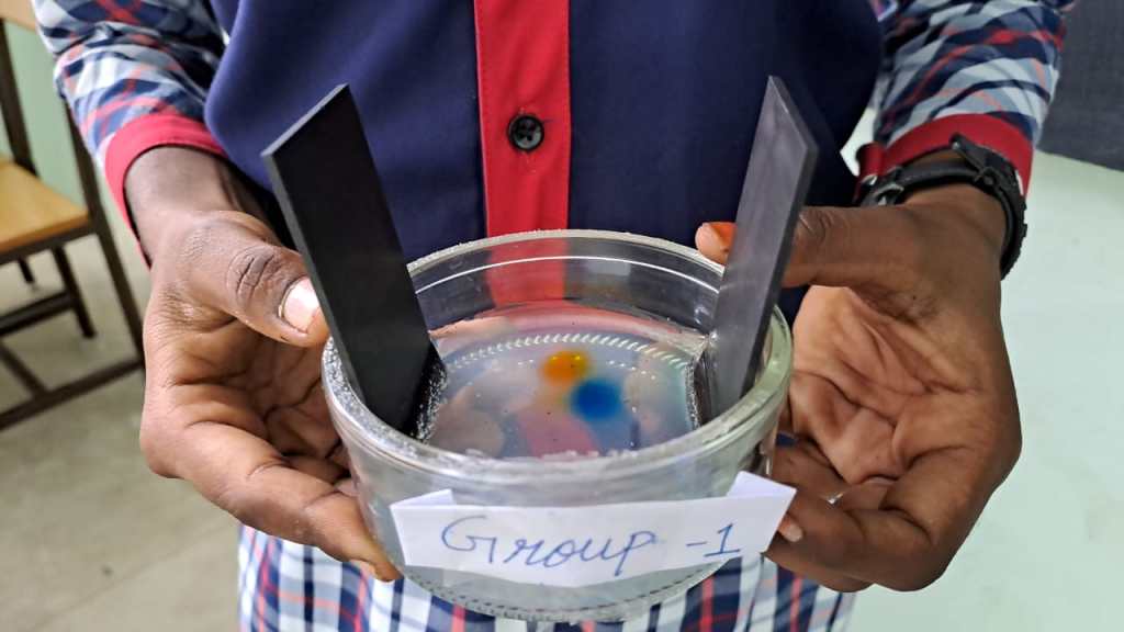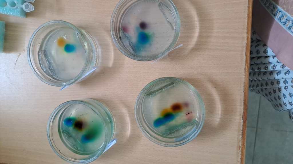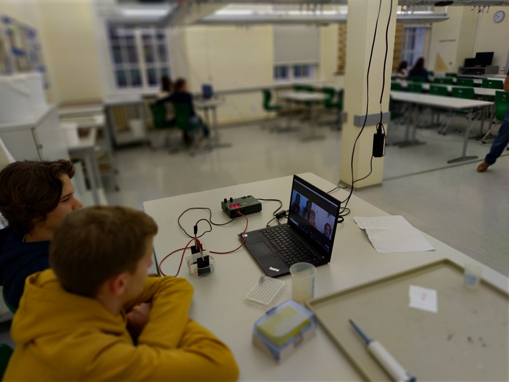 Together, the students learned how to use micropipettes, practiced using them and then separated different ink dyes according to size using low-cost electrophoresis.