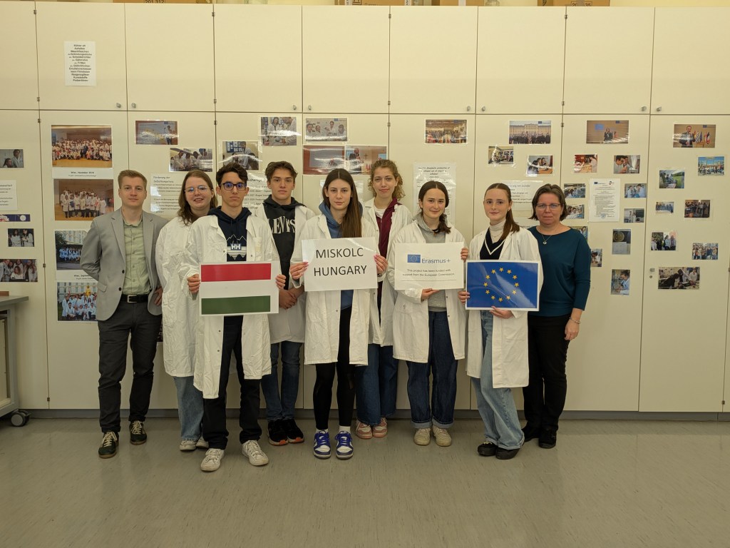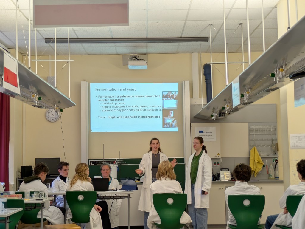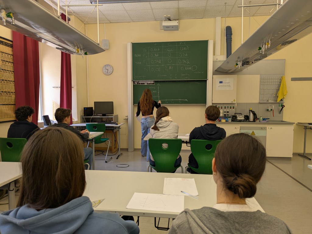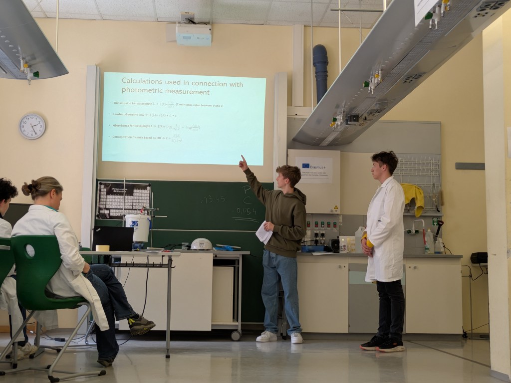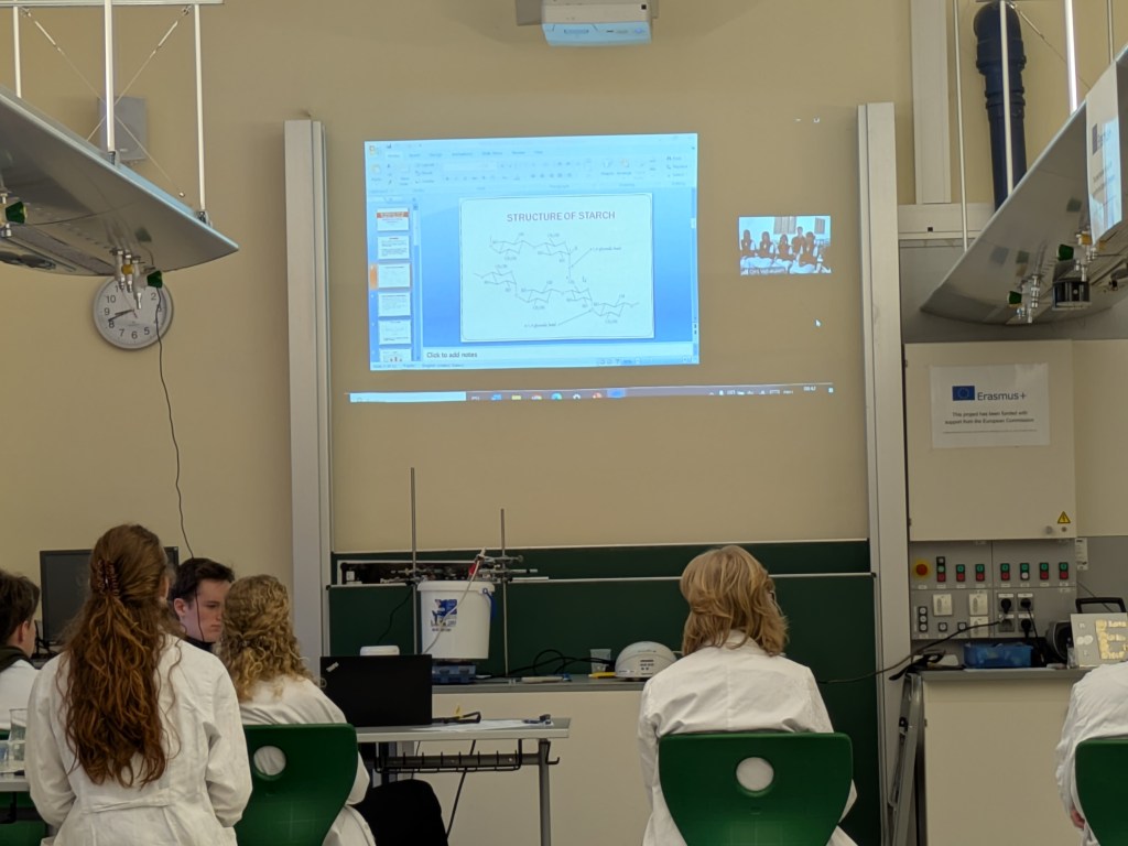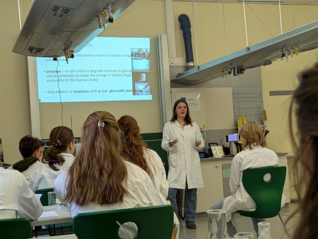 During the Erasmus+ 2025 week in Vienna we carried out experiments on the enzymatic degradation and fermentation of cellulose and starch in internationally mixed small groups. Thanks to presentations from students from Vienna, Hungary, Poland and India (online), we learned about the theoretical background of the experiment. After adding the enzymes cellulase and amylase respectively we measured the increasing concentration of glucose photometrically. As expected, an increase could be observed in every group. After adding yeast, the fermentation was measured by a decrease of the glucose concentration. The experiment was completed by an intense discussion of the results.